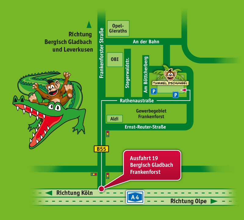 Viele Familien aus Bergisch Gladbach, Köln und dem Rhein-Berg-Kreis schätzen am Indoorspielplatz Tummel Dschungel die unkomplizierte Anfahrt. Von der A4 sind es nur wenige Minuten bis zu uns.