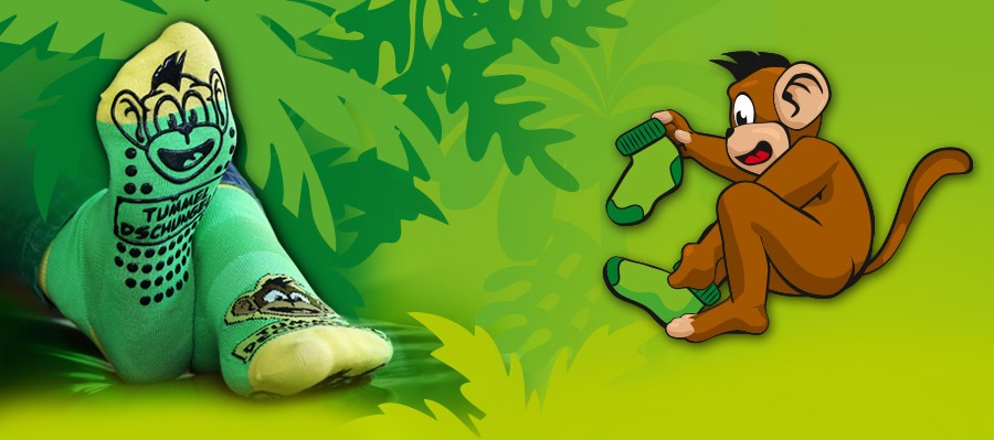 Die schicken Tummel Dschungel Anti-Rutschsocken sind in unterschiedlichen Größen an der Kasse erhältlich.